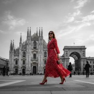 Woman in Red Dress Walking Before an Ancient Palace
