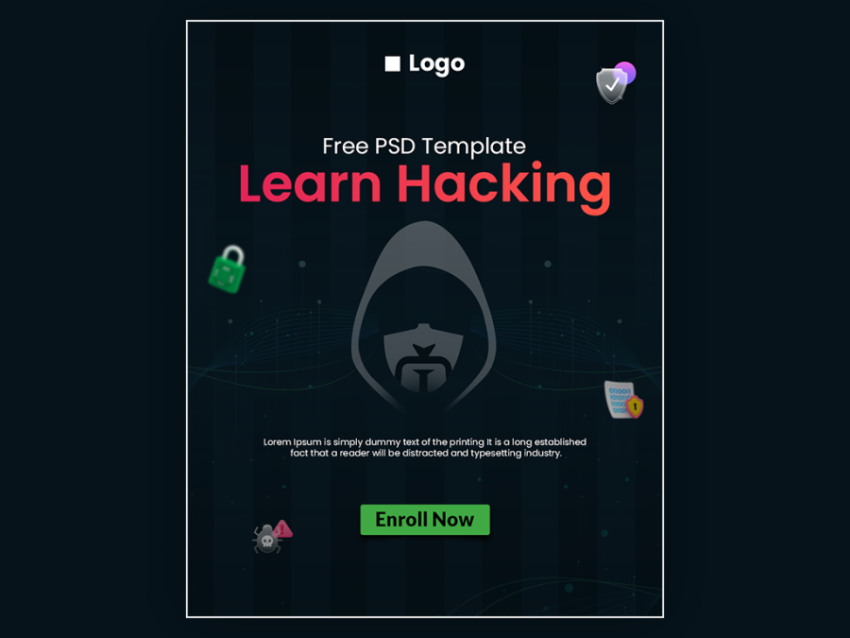 If you are looking for ethical hacking related banner design, then don't think too much. We have prepared this kind of Ethical Hacking Online Learning Promotion Banner Design for people like you, This design comes in online learning, online courses, digital learning, e-learning catagory, in this ethical hacking banner design there is a hacker face in the middle, in the background there are hacking related vector elements, the whole thing is done in a dark background, you can easily change the content, image, Visit our website for similar banner designs.