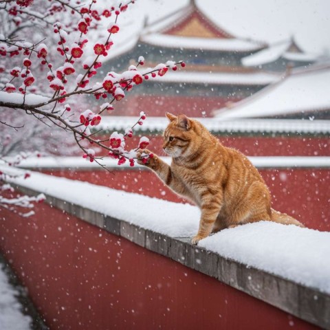 Cat Crouching Near Red Palace Wall Background