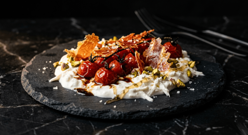 Luxury Stracciatella Cheese with Roasted Cherry Tomatoes Iberian Jamón