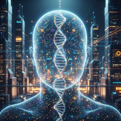 Futuristic Glowing DNA Particles with Human Head