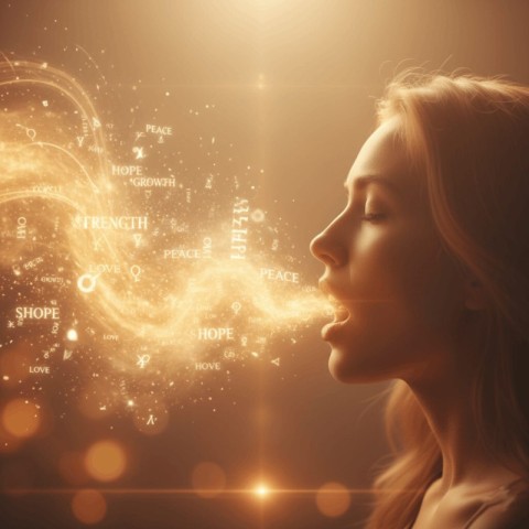 Luminous words and symbols are coming from the woman's Mouth