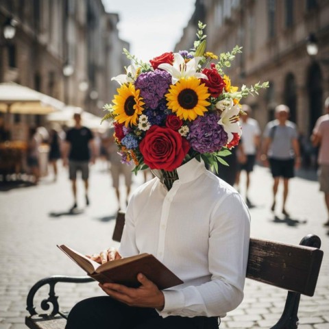 Surreal Man Sitting on Park Bench Reading Book with Flower Bouquet Head Concept Art