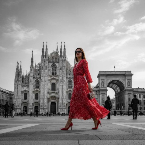 Woman in Red Dress Walking Before an Ancient Palace by marin