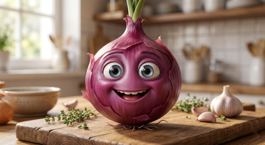 3D Realistic Cartoon Purple Onion Character with Eyes and Mouth