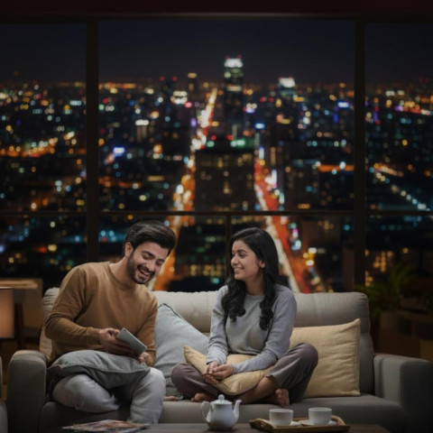 Happy Couple Sitting on Sofa Talking Wallpaper