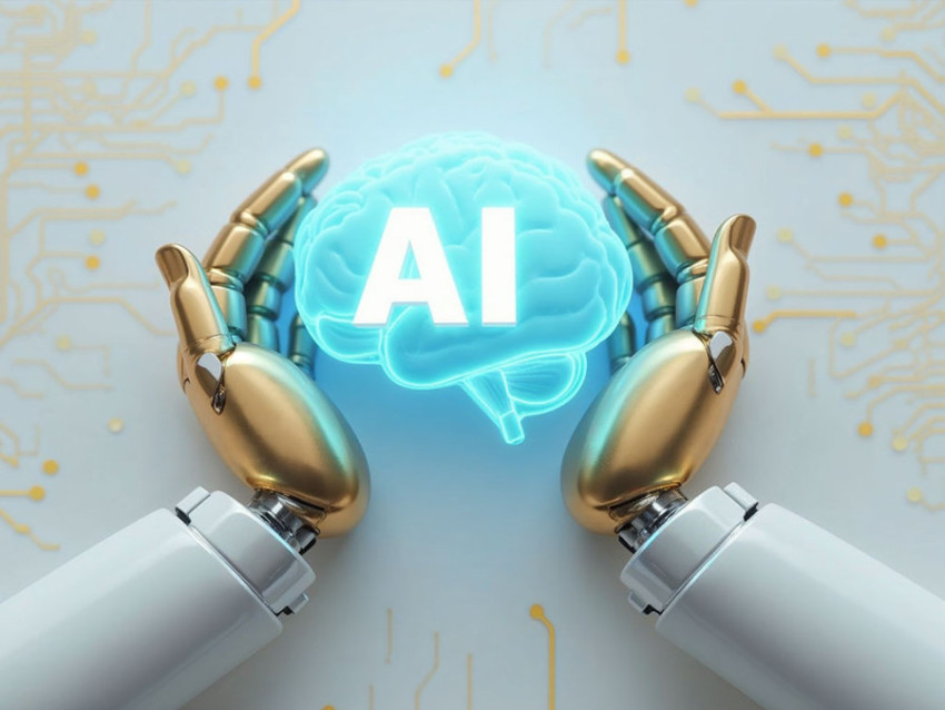 Robotic Hands Holding a Brain Glowing AI Text