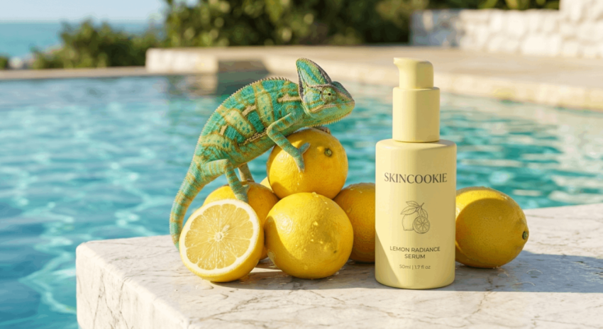 Luxury Skincare Product Photography with Chameleon and Lemons