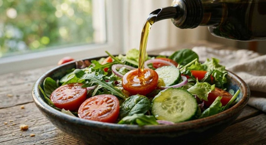 Olive Oil Pouring Over Fresh Vegetable Salad