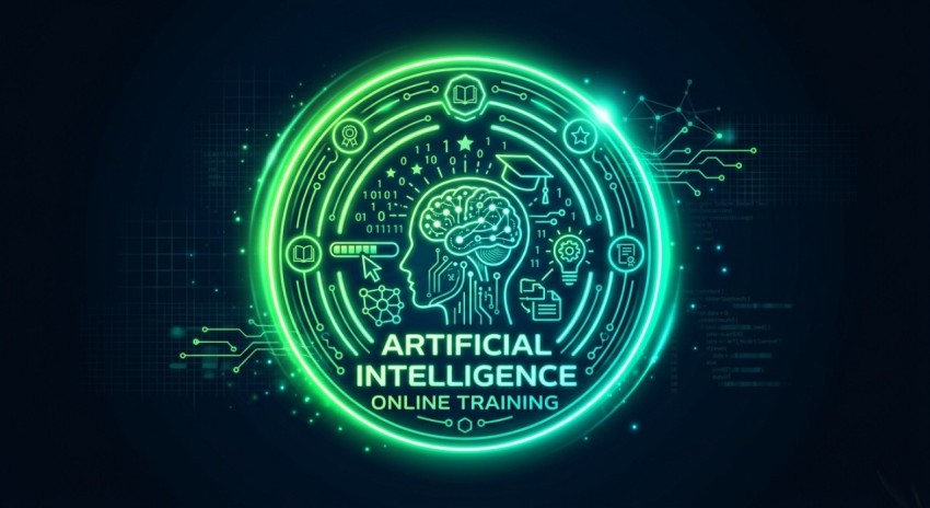 A futuristic circular motif design representing artificial intelligence and modern digital learning. This glowing tech-themed illustration features AI-driven elements, symbolizing online education, machine learning, and innovation. Perfect for technology presentations, AI training platforms, websites, and digital education branding.