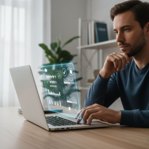 Person Using a Laptop with a Transparent Holographic Interface