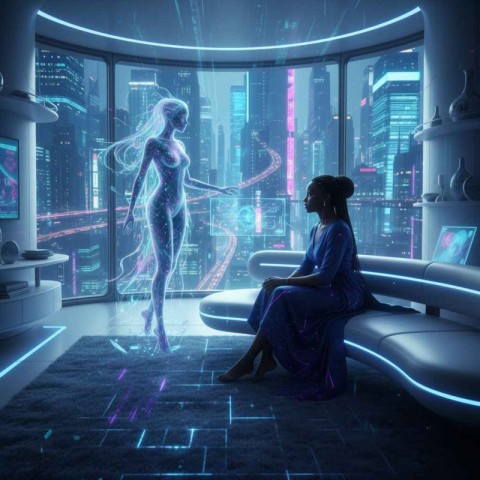 futurism human ai cool neon city cyberpunk holographic interfaces apartment future discussion expression flying living space massive city robotic intelligent framing virtual hologram surfaces ai assistant glowing megacity futuristic futuristic ai technology concept black woman hologram virtual hologram conversation ai technology concept futuristic digital communication woman interacting with hologram artificial intelligence interface future technology illustration digital assistant hologram scifi communication conceptSimilar Photos