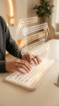 glowing keyboard with holographic messages typing on glowing keyboard holographic chat bubbles futuristic messaging concept ai communication visual digital chat interface neon keyboard typing modern technology background 4k photorealistic tech image warm ambient lighting shallow depth of field vertical tech composition ui ux concept art data stream visualization hand typing glowing keyword text streams futuristic floating text office work man typing keyword man working on computerSimilar Photos