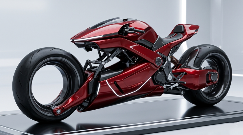 A striking futuristic red motorcycle with a unique scissor-shaped design, blending cutting-edge innovation with bold aesthetics. This concept showcases advanced engineering and sci-fi inspiration, making it perfect for futuristic vehicle design themes, digital art, and modern transportation visuals.