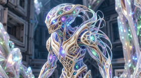 Discover a never-seen-before alien species crafted from organic micro-circuit structures, blending futuristic technology with natural beauty. This ultra-detailed sci-fi artwork features intricate Art Deco and MC Escher-inspired patterns, creating a mesmerizing sense of depth and dimension. Rendered in stunning 4K and 8K HDR quality, the luminous creature showcases bioluminescent threads, fractal-like formations, and glowing crystalline nuclei. With elegant tones of white, metallic gold, ivory, brushed titanium, and copper, combined with vibrant blues, purples, and greens, this high-definition CGI masterpiece highlights surreal textures and otherworldly design in a visually captivating composition.