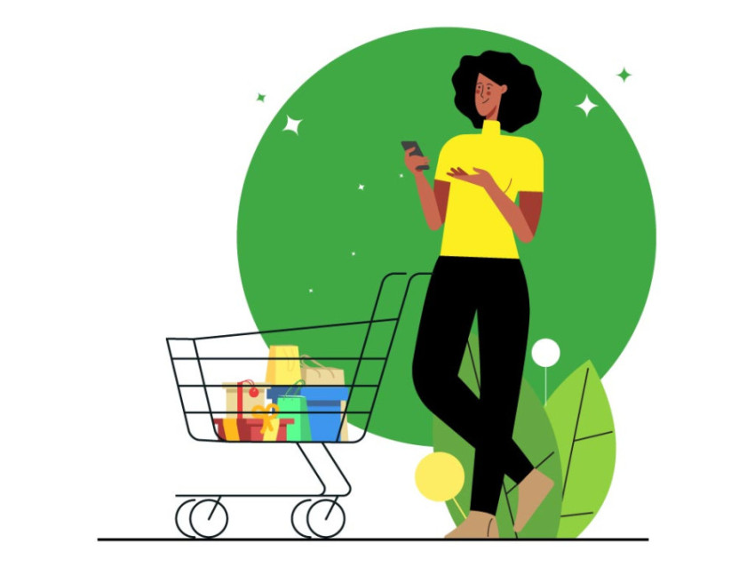 Vector Young Girl with Shopping Cart And Girl Looking in to Phone